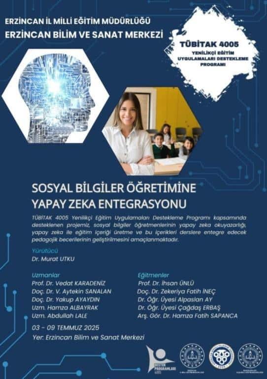 TÜBİTAK 4005 Yenilikçi Eğitim Uygulamaları kapsamında hazırlanan "Sosyal Bilgiler Öğretimine Yapay Zekâ Entegrasyonu" projesine okulumuz öğretmenleri Sevda SAY ve Nurcan AÇIKYILDIZ katılım sağlayacaklardır. Erzincan Bilim ve Sanat Merkezi Sosyal Bilgiler Öğretmeni Dr. Murat UTKU'nun yürütücülüğünü üstlendiği projede, 3-9 Temmuz 2025 tarihleri arasında Erzincan Binali Yıldırım Üniversitesi'nde 48 saatlik yoğun bir eğitim programı uygulanacaktır. Bu proje ile öğretmenlerin yapay zeka okuryazarlığı, dijital materyal geliştirme öz yeterliliği ve dijital okuryazarlık becerilerinin geliştirilmesi hedeflenmektedir.